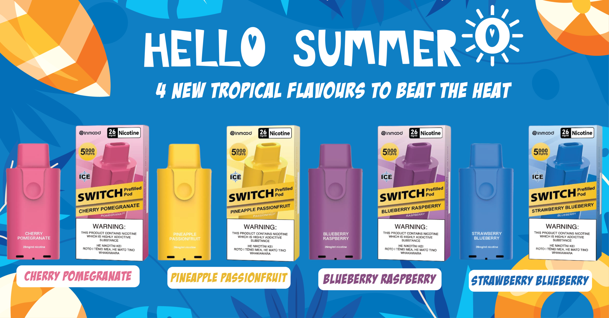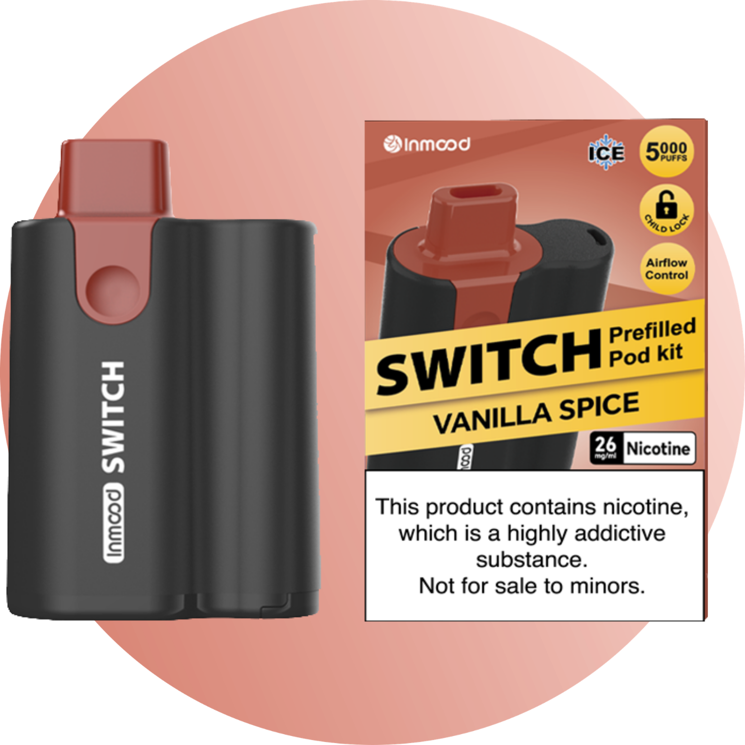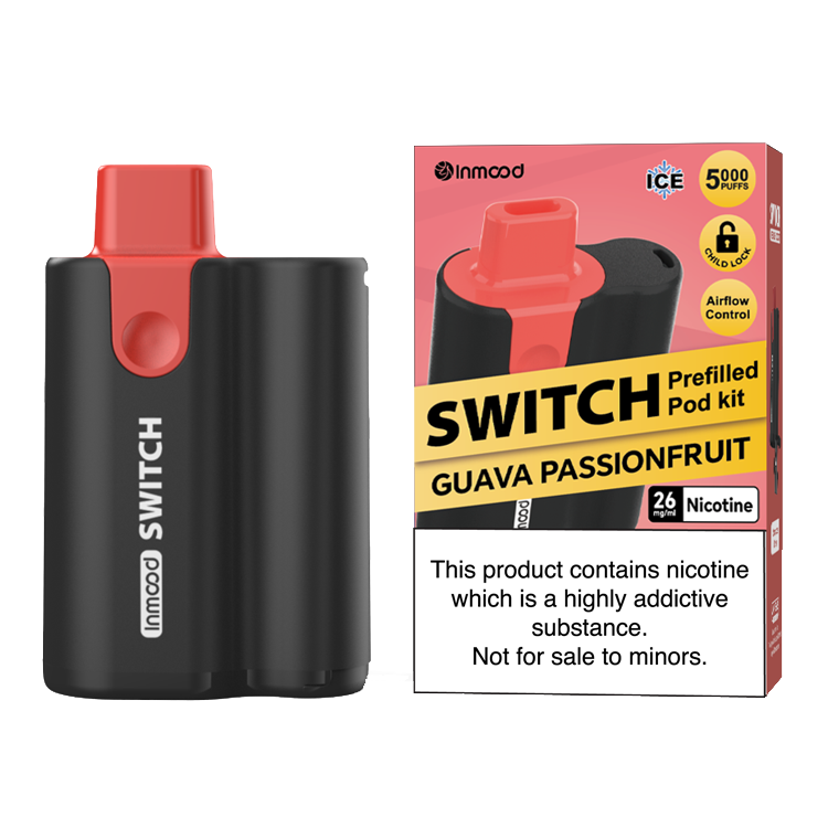 The Inmood Switch 26mg (4% / 40mg salt nicotine) replacement pods come in a wide and exciting range of flavors designed for a bold and satisfying experience. The collection includes Banana, Banana Custard, Berry Lemon (Pink Lemonade), Blackberry, Blueberry, Blueberry Cherry, Blueberry Lemon, Blueberry Raspberry, Cherry Pomegranate, Grape, Grape Berry (Cranberry Grape), Guava Passionfruit (Kiwi Passionfruit Guava), Kiwifruit Pineapple, Lychee, Mango Peach, Peach, Peach Blueberry, Peach Lemon, Peach Pineapple (Peach Pineapple Lime), Pineapple, Pineapple Passionfruit, Raspberry Grape, Sour Apple, Strawberry, Strawberry Banana, Strawberry Blueberry, Strawberry Kiwifruit, Sweet Berry (Mixed Berry Ice), Watermelon (Lush Ice), Coffee, Strawberry Custard, Tea, Vanilla Custard, Vanilla Spice (Cola Ice), Lemon Mint, Menthol, Mint (Cool Mint), and Tobacco (Golden Tobacco) — offering everything from fruity and tropical blends to dessert-inspired, cooling, and classic tobacco profiles.